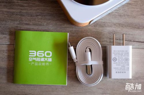 在配件部分搭配了说明书和电源适配器、数据线,从说明书可以简单了解“360空气检测大师”的一些操作教程。而搭配的电源适配器输出为5V 1000mA,为了搭配整体颜色,同样都是采用白色作为主体色
